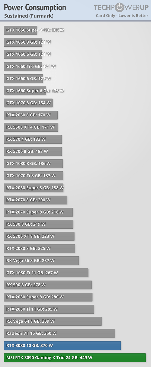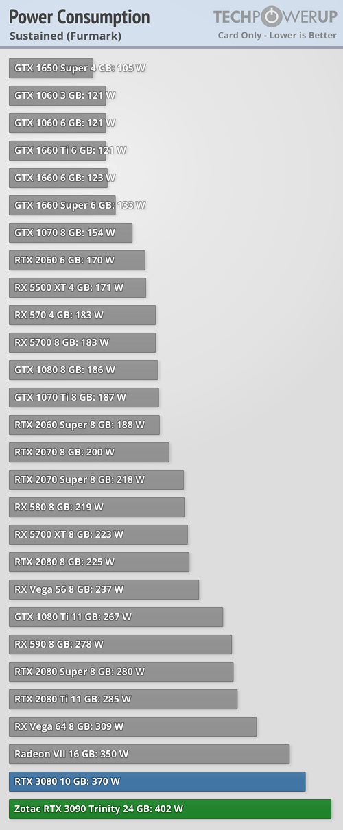 Los valores indicados se refieren a si la tarjeta gráfica tiene dos conectores PCIe (modelo Trinity) o tres conectores (modelo Gaming X Trio) de ocho pines, por lo que habrá que tener en cuenta que si se quiere una RTX 3090 que dé su máximo potencial será necesario elegir un modelo de tres PCIe. De esta forma, con dos conectores consume de media en juegos unos 379 W según las pruebas de TechPowerUp y los 406 W con tres; los valores máximos en estrés son de 402 W y 449 W, bastante por encima de los 350 W de referencia indicados por NVIDIA, aunque bien es cierto que los valores de la primera tarjeta son con la frecuencia de referencia de 1695 MHz y la segunda es con 90 MHz de subida, alcanzando los 1785 MHz.